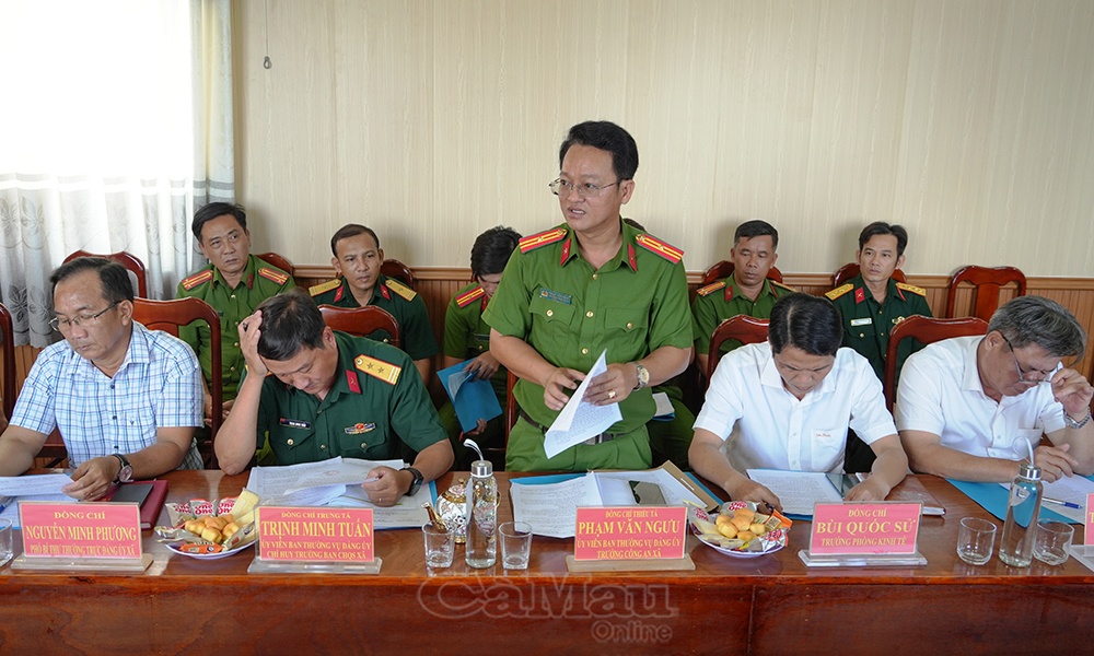 Thiếu tá Phạm Văn Ngưu, Trưởng Công an xã Phú Mỹ, báo cáo công tác đảm bảo an ninh trật tự trên địa bàn, đồng thời có những đề xuất, kiến nghị với Đoàn công tác số 2.