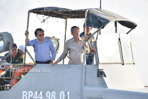 Bí thư Tỉnh ủy - Lữ Văn Hùng (bìa phải) ra biển kiểm tra thực tế công tác tuần tra, kiểm soát trên ngư trường của tỉnh. Ảnh: C.L