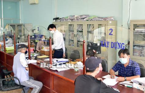 Cán bộ, công chức Phường 1 (TP. Bạc Liêu) thực hiện nghiêm Chỉ thị 12 trong thời gian giãn cách xã hội. Ảnh: H.T
