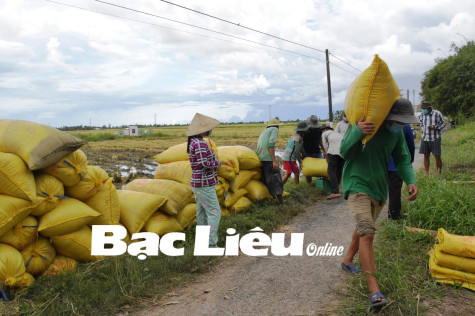 Nông dân ấp Hòa Linh (xã Long Thạnh, huyện Vĩnh Lợi) bán lúa hè thu tại ruộng cho thương lái.