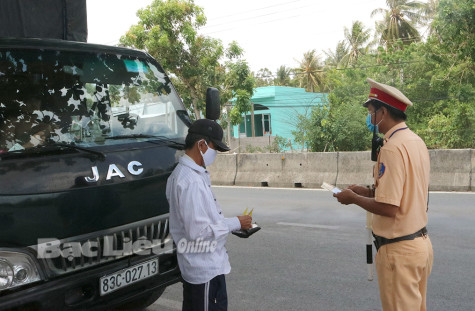UBND tỉnh chủ trương tạo điều kiện để lái xe, phụ xe vận tải hàng hóa liên tỉnh nghỉ lại trên địa bàn song phải đáp ứng yêu cầu phòng, chống dịch. Trong ảnh: CSGT tỉnh kiểm soát tài xế vào địa bàn trên tuyến quốc lộ 1A - huyện Vĩnh Lợi. Ảnh: T.H