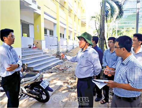 Lãnh đạo huyện Ngọc Hiển đôn đốc nhà thầu đẩy nhanh tiến độ thi công để phục vụ năm học mới. |