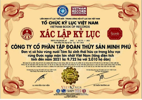 Văn bản của Tổ chức Kỷ lục Việt Nam xác lập kỷ lục Công ty cổ phần Tập đoàn Thuỷ sản Minh Phú là đơn vị sở hữu vùng nuôi tôm sú sinh thái hữu cơ lớn nhất Việt Nam.