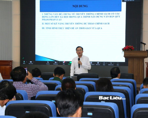 Ngày 30/8, Sở Tư pháp - Cơ quan Thường trực Hội đồng Phối hợp phổ biến, giáo dục pháp luật (PBGDPL) tỉnh Bạc Liêu tổ chức Hội nghị trực tiếp kết hợp trực tuyến tại 7 điểm cầu cấp huyện và 64 điểm cầu cấp xã tập huấn kỹ năng truyền thông chính sách có tác động lớn đến xã hội trong quá trình xây dựng văn bản quy phạm pháp luật năm 2023.