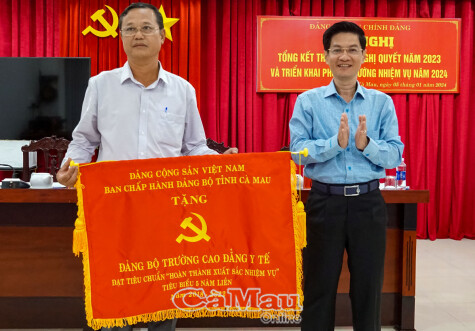 Dịp này, Ban Thường vụ Tỉnh uỷ tặng cờ thi đua cho Trường Cao đẳng Y tế tỉnh Cà Mau về thành tích đạt tiêu chuẩn hoàn thành xuất sắc nhiệm vụ 5 năm liền (2018-2022) và tặng Bằng khen cho 6 đảng viên hoàn thành xuất sắc nhiệm vụ 5 năm liền (giai đoạn 2018-2022). (Trong ảnh: Đồng chí Trương Đăng Khoa, Bí thư Đảng uỷ Dân Chính Đảng trao cờ cho Trường Cao đẳng Y tế Cà Mau).
