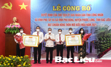 Lãnh đạo tỉnh trao Quyết định công nhận xã Vĩnh Phú Tây và Vĩnh Phú Đông (huyện Phước Long) đạt chuẩn NTM kiểu mẫu. Ảnh: M.Đ
