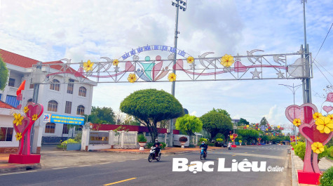 Trang trí cổng chào về Ngày hội Văn hóa - Du lịch Bạc Liêu xung quanh Quảng trường Hùng Vương. Ảnh: H.T