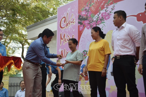 | Trưởng Ban Dân vận Tỉnh ủy, Chủ tịch UB MTTQ Việt Nam tỉnh Lê Dũng trao quà cho công nhân viên chức, người lao động có hoàn cảnh khó khăn vui xuân đón Tết. |