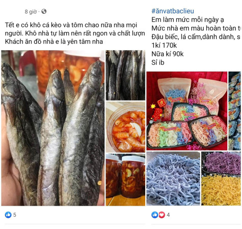 Những ngày qua, trên rất nhiều Fanpage, Facebook, diễn đàn online đều thấy tràn ngập các hình ảnh rao bán thực phẩm “nhà làm” phục vụ Tết với đủ loại mẫu mã, thương hiệu cá nhân. Các mặt hàng này được quảng cáo là mứt, khô không sử dụng chất bảo quản, không phẩm màu, không chất phụ gia, chỉ sử dụng phụ gia làm bằng rau củ, an toàn vệ sinh tuyệt đối… Những mặt hàng được rao bán phổ biến nhất là các loại bánh, mứt, bánh tét, tôm chao, củ kiệu, các loại khô… Giá các mặt hàng đa số đều cao hơn ở chợ, siêu thị từ 10 - 20%. Mặc dù giá thành nhỉnh hơn, nhưng những thực phẩm này được khá nhiều người ưa chuộng. Họ chấp nhận bỏ ra số tiền cao hơn với mong muốn được sử dụng những sản phẩm có chất lượng, an toàn vệ sinh thực phẩm.