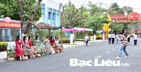 Bạn trẻ du xuân, chụp ảnh lưu niệm tại đường hoa 30/4. Ảnh: H.T