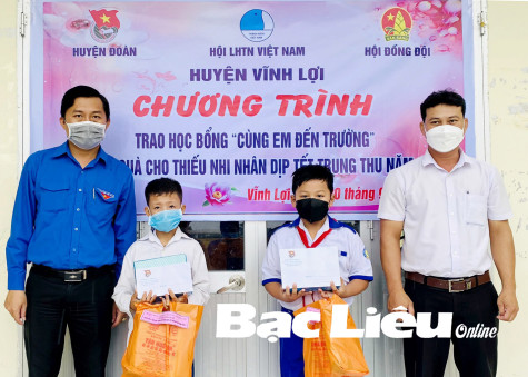 Huyện đoàn - Hội LHTN Việt Nam huyện - Hội đồng Đội huyện Vĩnh Lợi tặng học bổng và tặng quà cho thiếu nhi nhân dịp tết Trung thu. Ảnh: H.L