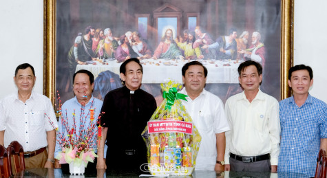| Uỷ viên Ban Thường vụ Tỉnh uỷ, Chủ tịch Uỷ ban MTTQ Việt Nam tỉnh Trần Văn Hiện (thứ 3 từ phải sang) tặng quà chúc mừng lễ Phục sinh đến Linh mục Chánh xứ Phaolo Nguyễn Văn Vinh, Chủ tịch Uỷ ban Đoàn kết Công giáo tỉnh. |