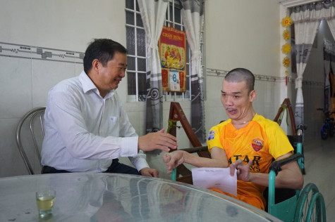 Phó Chủ tịch UBND tỉnh Thân Đức Hưởng ân cần hỏi thăm sức khỏe và tặng quà cho gia đình nạn nhân CĐDC Huỳnh Thanh Vũ thương binh 4/4, phường 1, TP Cà Mau