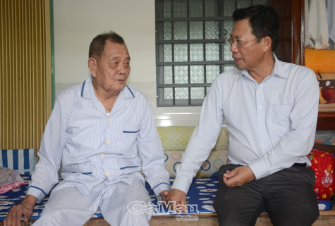 | Phó chủ tịch HĐND tỉnh Cà Mau Dương Huỳnh Khải ân cần thăm hỏi sức khoẻ ông Phan Văn Diệp (90 tuổi, người hoạt động kháng chiến, nhiễm chất độc hoá học, ngụ ấp Ba Tiệm, xã Phú Mỹ). |