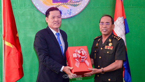 | Thiếu tướng Yong Mao, Cục phó Thường trực Cục Phát triển, Bộ Quốc phòng, Quân đội Hoàng gia Campuchia, tặng quà lưu niệm đến đồng chí Lê Minh Ý, Uỷ viên Ban Thường vụ Tỉnh uỷ, Chủ nhiệm Uỷ ban Kiểm tra Tỉnh uỷ Cà Mau. |