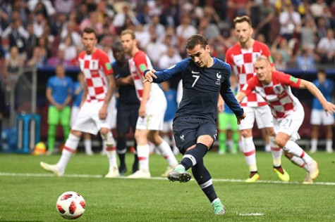 Chơi lép vế trong phần lớn thời gian, nhưng tuyển Pháp một lần nữa có bàn thắng từ sai lầm của đối thủ. Đó là tình huống diễn ra ở phút 34, trong nỗ lực tham gia phòng ngự chống phạt góc, Perisic để bóng chạm tay. Nhờ đến công nghệ VAR, trọng tài chính cho Pháp hưởng 11m. Trên chấm đá phạt, Griezmann tự tin đánh lừa thủ thành Subasic, ghi bàn giúp tuyển Pháp tạm dẫn 2 – 1 sau 45 phút đầu tiên.