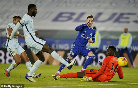 Có thế trận tốt và bàn thắng từ khá sớm, Bầy sói thi đấu trơn tru hơn và liên tục gây sức ép trước Chelsea. Trước khi hiệp 1 khép lại ở phút 41, từ pha phát động phản công nhanh, Vardy thoát xuống, va chạm với 1 hậu vệ của Chelsea trong vòng cấm. Tuy nhiên trọng tài chính không cất còi, cho Leicester được hưởng phép lợi thế. Tận dụng nhanh pha bóng này, Maddison xử lý gọn gàng, tung cú dứt điểm chuẩn xác, giúp đội chủ nhà tạm dẫn 2 – 0 sau 45 phút bóng lăn.
