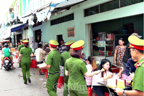 Cán bộ, chiến sĩ Phòng Cảnh sát Điều tra tội phạm về ma tuý Công an tỉnh phát tờ rơi tuyên truyền khắp ngõ hẻm TP Cà Mau.