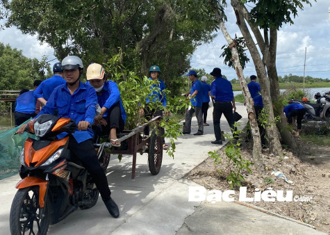 Đoàn viên - thanh niên TX. Giá Rai ra quân làm vệ sinh môi trường và trồng cây hoàng yến dọc theo tuyến lộ thuộc ấp 10A (xã Tân Phong). Ảnh: T.L