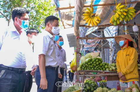 | Chủ tịch UBND tỉnh Cà Mau Lê Quân (bìa phải) kiểm tra công tác phòng, chống dịch Covid-19 tại chợ Rạch Gốc, huyện Ngọc Hiển. |