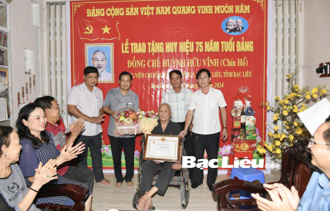 Chiều ngày 7/2/2024, được sự ủy nhiệm của Ban Thường vụ Tỉnh ủy, Thành ủy TP. Bạc Liêu đã tổ chức Lễ trao tặng Huy hiệu 75 năm tuổi Đảng đợt 1 năm 2024 tại nhà riêng cho đồng chí Huỳnh Hữu Vĩnh (Chín Hổ - ảnh), đảng viên Chi bộ Khóm 3, Phường 5, TP. Bạc Liêu.