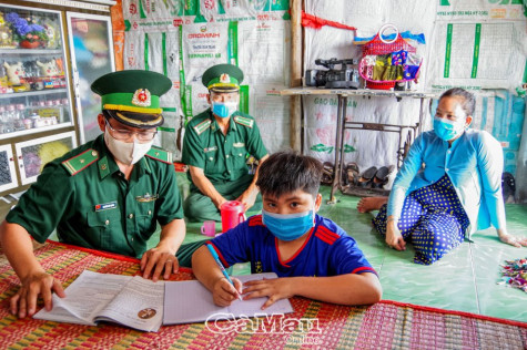 Chúng tôi đến thăm gia đình cháu Võ Thanh Văn, 9 tuổi, học sinh lớp 3, Trường Tiểu học Mạc Cửu, xã Khánh Tiến, huyện U Minh. Ðại uý Quơn cho biết, Văn là 1 trong 3 cháu đang được đơn vị nhận đỡ đầu và giúp đỡ mỗi tháng 500.000 đồng từ lớp 1 cho đến hết lớp 12. Em Văn thuộc diện gia đình hoàn cảnh đặc biệt, mồ côi cha từ nhỏ, mẹ bị bệnh nhiễm trùng máu, nhà nghèo, không đất sản xuất. Mẹ con Văn phải nhờ sự cưu mang của bà ngoại năm nay đã gần 70 tuổi. Năm học mới 2021-2022 này, mẹ Văn đang ở Sài Gòn trị bệnh, do dịch Covid-19 nên không về được. Cán bộ, chiến sĩ biên phòng phải đi mua sổ sách, đồ dùng học tập, thêm bộ quần áo mới để Văn bước vào năm học mới.