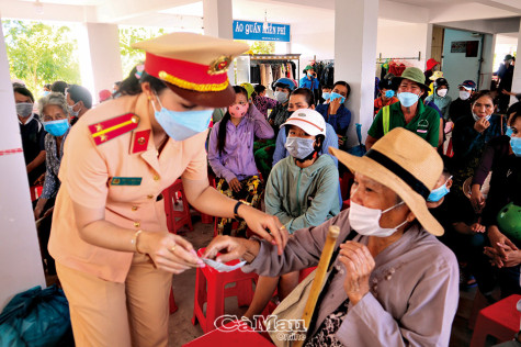 | Đoàn viên Công an huyện Ngọc Hiển hướng dẫn người dân đến khám sức khoẻ hậu Covid-19. |