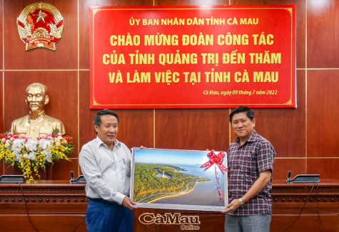 | Phó chủ tịch UBND tỉnh Cà Mau Lê Văn Sử (bên phải) tặng quà lưu niệm cho Phó chủ tịch UBND tỉnh Quảng Trị Hà Sỹ Đồng. |