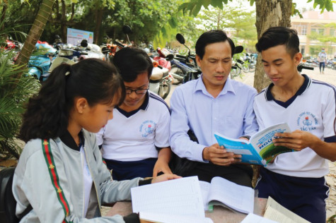 Thầy Nguyễn Thanh Đảm, Tổ trưởng Tổ văn Trường THPT Tắc Vân, cùng học sinh thảo luận về các đề thi Ngữ văn. |