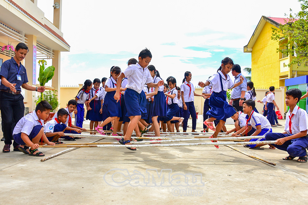 Thầy giáo Trịnh Bá Ngọc cùng học trò hoà mình trong giờ ra chơi trải nghiệm sáng tạo.