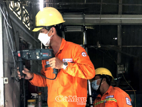 | Nhân viên Ðiện lực TP Cà Mau thay thế ổ cắm điện cho gia đình bà Lê Kim Hoa. |