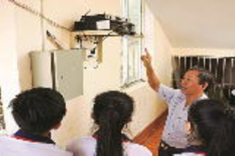 Thầy Tạ Đức Hùng, Hiệu trưởng Trường THCS Võ Thị Sáu nhắc nhở học sinh bảo quản và sử dụng các thiết bị điện tại trường học hiệu quả, an toàn và tiết kiệm. |