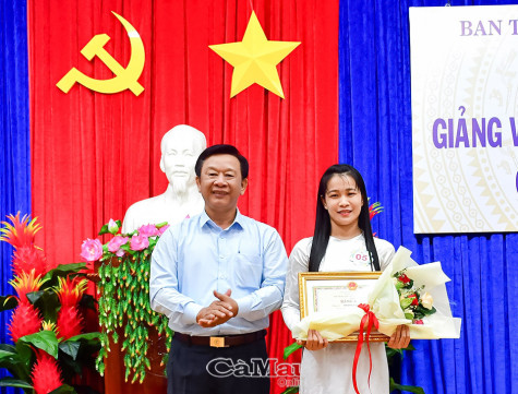 | Uỷ viên Ban Thường vụ Tỉnh uỷ, Trưởng ban Tuyên giáo Tỉnh uỷ Hồ Trung Việt, Trưởng ban Tổ chức hội thi, trao giải Nhất cho thí sinh Thang Phương Thảo (đơn vị Trung tâm Chính trị huyện Trần Văn Thời). |
