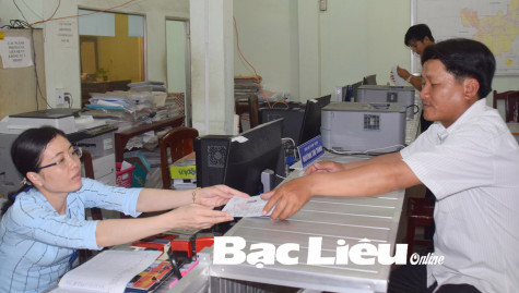 Cán bộ, đảng viên bộ phận Một cửa của thị trấn Châu Hưng (huyện Vĩnh Lợi) tận tình phục vụ người dân. Ảnh: H.L