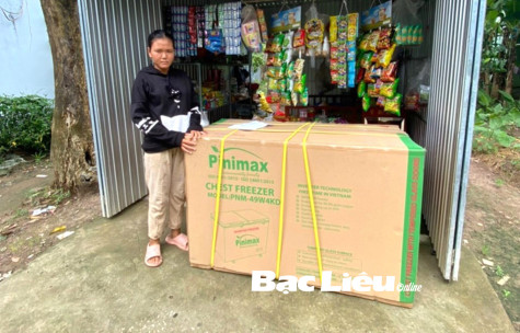 Một hộ đồng bào dân tộc thiểu số ở thị trấn Hòa Bình được hỗ trợ tủ làm mát để mua bán tạp hóa.