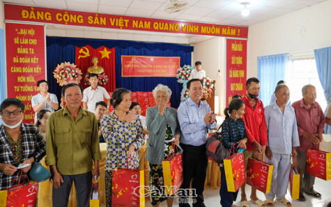 Người dân xã Tân Bằng, huyện Thới Bình vui mừng khi nhận những phần quà Tết.