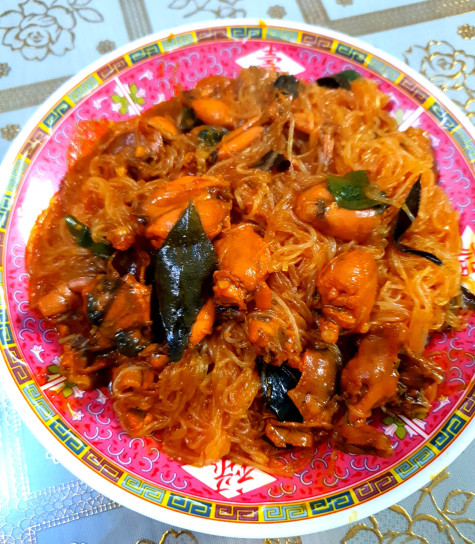 Một số người thích ăn ếch còn để nguyên da, riêng khẩu vị của gia đình tôi thì phải lột sạch da ếch ăn mới… mạnh miệng. Ếch mua về sau khi đã sơ chế sạch sẽ thì rửa với nước muối hoặc nước cốt chanh để ếch bớt nhớt và khử mùi tanh. Sau đó, ướp thịt ếch với muối, đường, bột nêm, bột cà-ri (tùy khẩu vị từng nhà, nếu muốn đậm mùi cà-ri thì ướp nhiều bột cà-ri). Sau khoảng 15 phút thì bắc chảo lên phi mỡ tỏi cho thơm, tiếp tục để lá cà-ri và sa tế vào xào (nếu nhà có trẻ em thì để ít sa tế hoặc không dùng), sau đó cho hỗn hợp thịt ếch đã ướp vào xào cho thịt xăn lại, tiếp đến đổ ít nước vào, để lửa riu riu cho thịt ếch thấm gia vị rồi nêm lại cho vừa ăn. Cuối cùng cho bún tàu (đã ngâm với nước trước đó) vào chảo rồi tắt bếp. Thế là có ngay dĩa thịt ếch thơm lừng, nóng hổi.