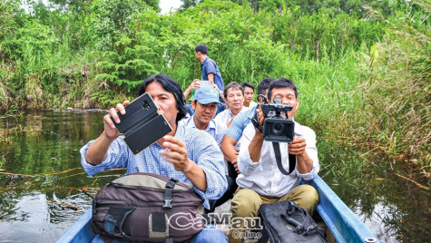 | Phóng viên báo Cà Mau và Ðài Phát thanh - Truyền hình tỉnh Cà Mau tác nghiệp tại điểm du lịch sinh thái Mười Ngọt, xã Khánh Bình Tây Bắc, huyện Trần Văn Thời. (Ảnh chụp ngày 30/6/2020) |