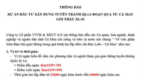 Công ty Cổ phần VTTB & XDCT 624 xin thông báo đến các Cơ quan, ban ngành, danh nghiệp và người dân tỉnh Cà Mau nói riêng và trên cả nước nói chung “ Về việc phân luôn đảm bảo giao thông trong quá trình lao lắp dầm cầu Bạc Liêu – Cà Mau” như sau: