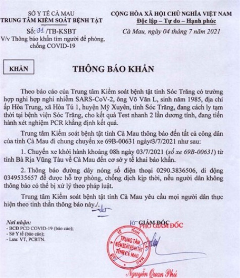 Chiều nay, 4/7, Trung tâm Kiểm soát bệnh tật tỉnh Cà Mau vừa phát đi thông báo khẩn tìm người đi trên chuyến xe mang biển kiểm soát 69B-00631, khởi hành lúc 8 giờ cùng ngày từ Bà Rịa - Vũng Tàu về Cà Mau.