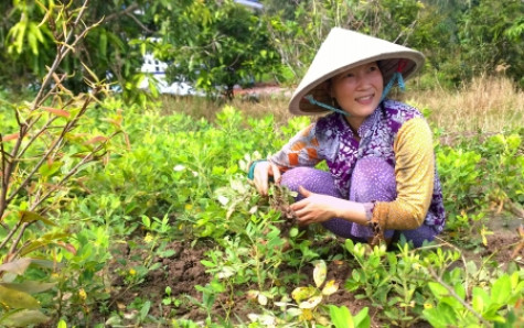 Chị Nguyễn Thanh Hoa, cùng ấp Xẻo Ðước, xã Phú Mỹ, cũng cải tạo đất quanh nhà trồng xen và luân canh đậu phộng với các loại hoa màu khác. Chị Hoa vừa thu hoạch đậu phộng trồng trên phần đất sân được khoảng chục ký để chuẩn bị cải tạo đất trồng dưa hấu.