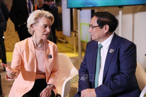 * Tại cuộc gặp Chủ tịch Ủy ban châu Âu (EC) Ursula von der Leyen, Thủ tướng Chính phủ Phạm Minh Chính khẳng định Việt Nam luôn coi trọng quan hệ đối tác và hợp tác toàn diện Việt Nam - Liên minh châu Âu (EU) và mong muốn EU cùng các quốc gia thành viên tăng cường hỗ trợ Việt Nam về tài chính, công nghệ, đào tạo nhân lực nhằm ứng phó với biến đổi khí hậu và chuyển đổi năng lượng trong khuôn khổ Tuyên bố chính trị về Đối tác chuyển đổi năng lượng công bằng (JETP).