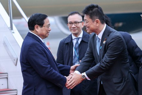 Đại sứ Việt Nam tại Nhật Bản Phạm Quang Hiệu đón Thủ tướng Phạm Minh Chính tại sân bay quốc tế Haneda ở Thủ đô Tokyo.
