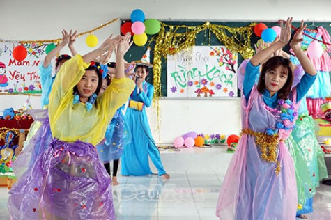Em Phan Hồng Thơ, sinh viên lớp 17MA, tâm sự: “Những tiết thực hành làm dụng cụ học tập cùng nhóm trình diễn trên lớp thực sự rất thú vị. Ví như đến bộ môn âm nhạc, sẽ tận dụng những vật liệu tự nhiên, những phế phẩm xung quanh nhà như chai nhựa, lon, xốp..., nhà bạn nào có gì thì gom lại, sau đó lên mạng tìm ý tưởng rồi cùng nhau tham khảo. Trung bình mỗi món như cây đàn hoặc chiếc trống nhóm chỉ mất từ 30-40 phút để hoàn thiện. Trong một lần soạn bài đứng lớp, nhóm chúng em sáng tạo những bộ trang phục được tái chế bằng áo mưa cũ, thêm dây ruy băng và hoa giả chỉ bằng những thứ đơn giản tưởng chừng như vứt đi, cho ra những bộ cánh rất đẹp, mình nhìn còn thích”.
