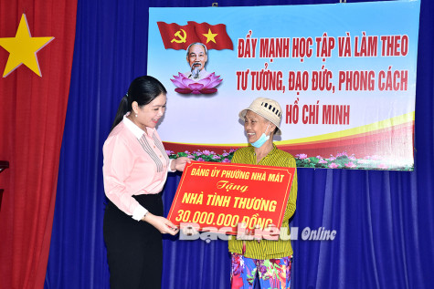 Bà Đoàn Hồng Lĩnh - Bí thư Đảng ủy phường Nhà Mát (TP. Bạc Liêu) trao biểu trưng tặng nhà tình thương cho hộ có hoàn cảnh khó khăn tại buổi sinh hoạt học và làm theo Bác. Ảnh: H.T