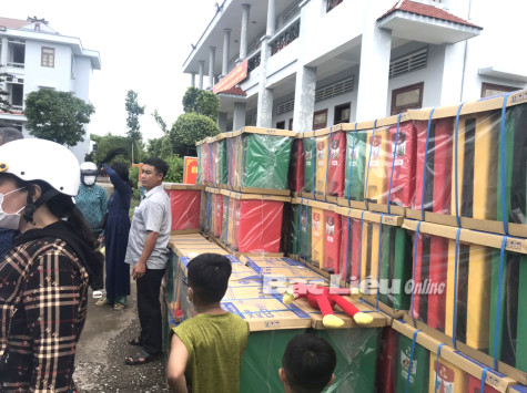 Cấp phát thùng rác phân loại rác tại nguồn cho người dân thị trấn Châu Hưng (huyện Vĩnh Lợi). Ảnh: K.K