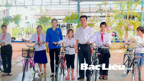 Chi đoàn Báo Bạc Liêu tặng xe đạp cho học sinh nghèo Xã đoàn kết nghĩa Phong Thạnh Đông A (TX. Giá Rai). Ảnh: N.A