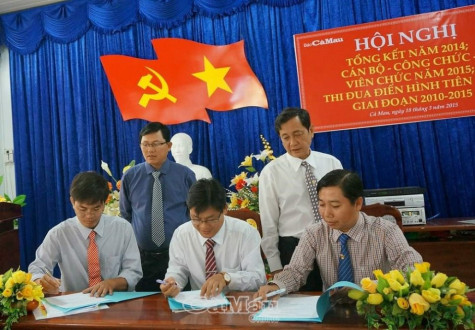 Nhà báo Châu Anh Dũng (bìa trái) ký kết thi đua giữa các phòng chuyên môn Báo Cà Mau năm 2015