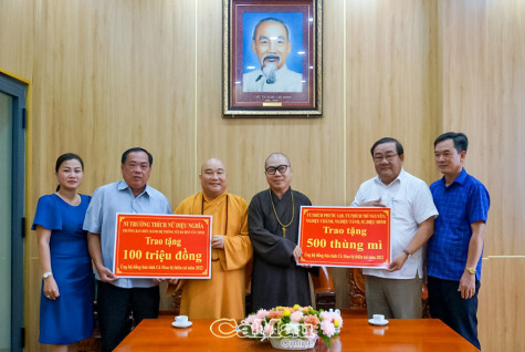 (CMO) Chiều ngày 10/8, Ủy ban MTTQ Việt Nam tỉnh tổ chức Lễ tiếp nhận 100 triệu đồng do Ni trưởng Thích Nữ Diệu Nghĩa, Trưởng Ban Điều hành hệ thống Chùa núi Bà Đen Tây Ninh và 500 thùng mì do Thượng tọa Thích Phước Lợi, Thượng tọa Thích Trí Nguyên, Ni sư Thích Nữ Diệu Chánh, Ni sư Thích Nữ Diệu Tánh và Sư cô Thích Nữ Diệu Minh ủng hộ đồng bào bị thiên tai trên địa bàn tỉnh Cà Mau.