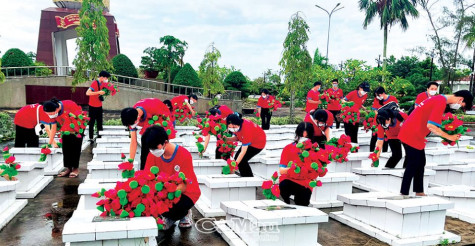 | Ðoàn viên, thanh niên huyện Cái Nước trang trí bình hoa tại các phần mộ liệt sĩ ở Nghĩa trang Liệt sĩ huyện. |
